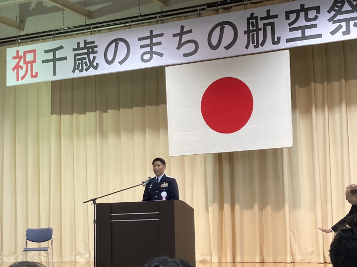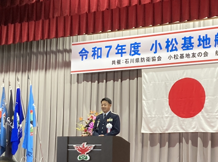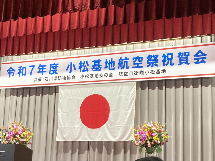 私は4日小松市内で開催された前夜祭に出席した際に、野村基地司令をはじめ基地の運営に携わる主要幹部に挨拶させていただく機会がありましたので、基地活動の状況などを拝聴することができ、所在部隊の活気ある雰囲気を十分に感じ取ることができました。当日については、基地体育館内における祝賀会に主席する前には、基地内の立入りが許可されている施設を数か所見学するとともに、慰霊碑に参拝させていただきました。